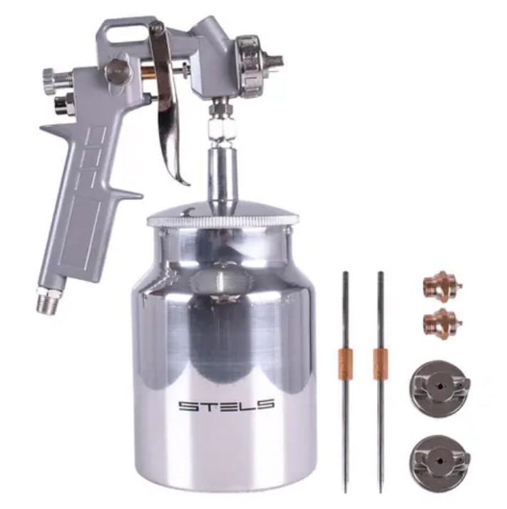 A Pistola de Pintura Stels é indicada para grandes demandas, pois possui um reservatório de 1 litro para tinta, primer, verniz ou outra aplicação. Tanto para aplicação em áreas maiores e chapadas, quanto em detalhes, isso devido aos 3 bicos (1.2, 1.5 e 1.8 mm) que acompanham a pistola.
